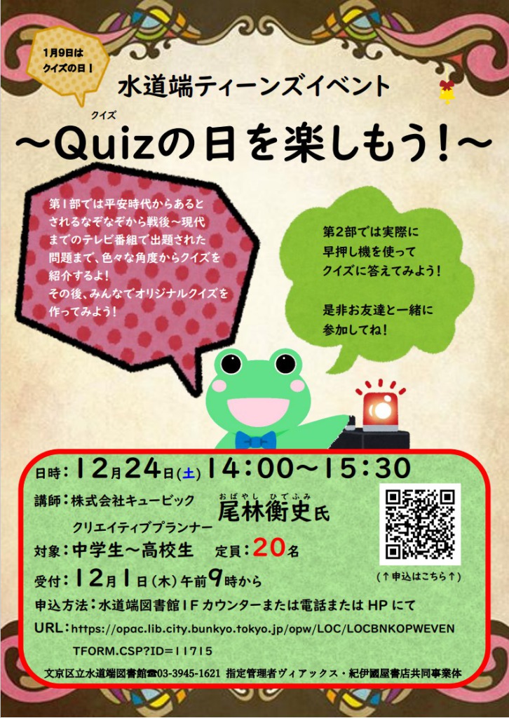 | 記事タイトル | 水道端ティーンズイベント~Quizの日を楽しもう~【12月24日イベント開催!】 |