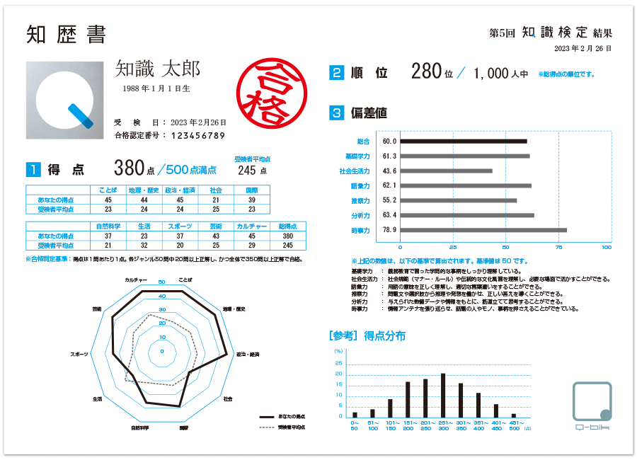 試験後にもらえる「知歴書」には、自身の順位や、各領域の偏差値などを掲載。