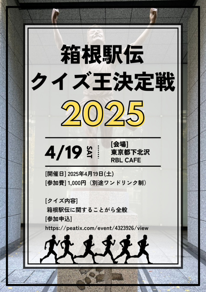 | 記事タイトル | 箱根駅伝クイズ王決定戦 開催決定!【2025年4月19日(土)10時~@下北沢】 |
