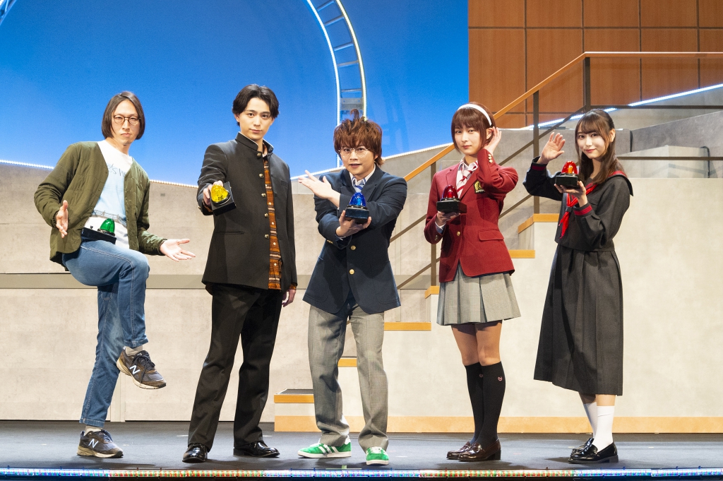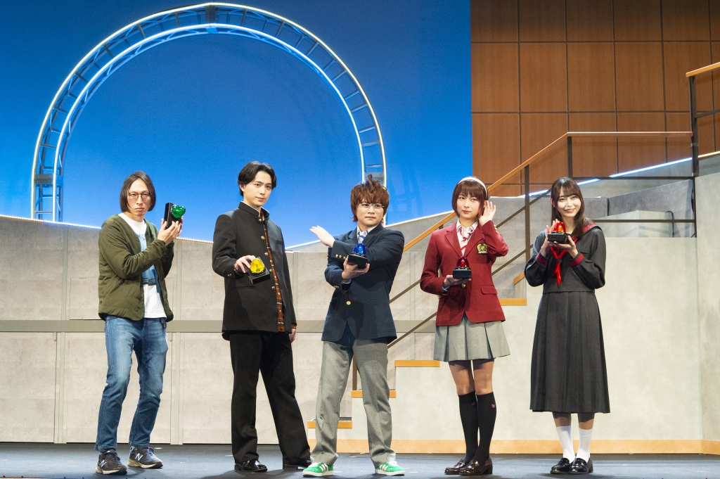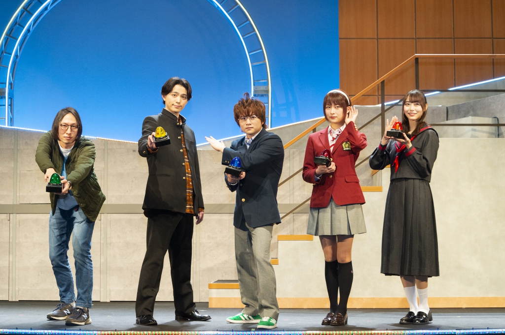 競技クイズに打ち込む高校生たちの青春を描いた人気漫画(作:杉基イクラ)を原作にした舞台シリーズ第三弾「ナナマル サンバツ THE QUIZ STAGE O(オー)」が、本日1月6日(水)に東京・銀座 博品館劇場にて開幕します。公演に先駆け初日舞台挨拶と公開ゲネプロが行われ、主演の西井幸人、鈴木絢音(乃木坂46)、佐奈宏紀、弓木奈於(乃木坂46)と、作・演出の大歳倫弘(ヨーロッパ企画)が登壇しました。