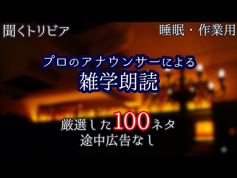 聞くトリビア 『選りすぐりの雑学100ネタ』 江頭剛 4年前 フリーアナウンサー大橋俊夫氏による朗読雑学シリーズ『聞くトリビア』特別編です。 これまでの動画の中から、選りすぐりの雑学をご紹介いたします。 聞くトリビアは毎週金曜日18時更新予定です。 『選りすぐりの雑学1』はこちら。 『選りすぐりの雑学2』はこちら。 『選りすぐりの雑学3』はこちら。 聞くトリビアの再生リストはこちら。