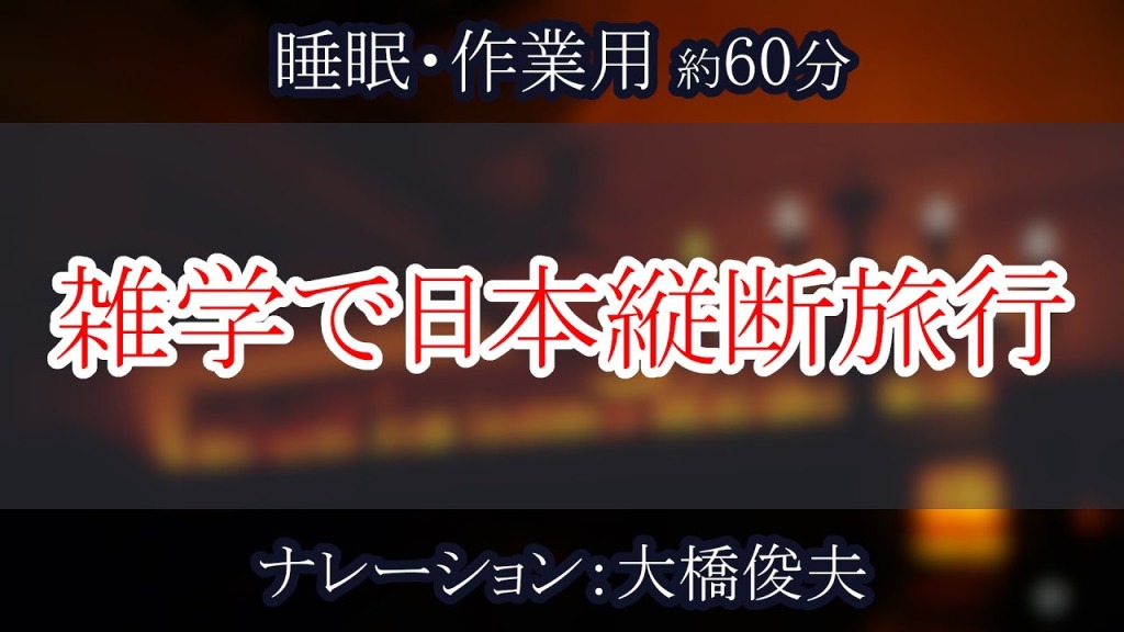 『雑学で日本縦断旅行』YOUTUBEにて公開!【雑学朗読動画”聞くトリビア”】 江頭剛 3年前 フリーアナウンサー大橋俊夫氏による朗読雑学シリーズ『聞くトリビア』公開です。 通勤・通学や家事の合間、作業用BGM、睡眠導入などにご活用ください。 一時間の長編ですので作業などにお役立てください。 聞くトリビアは隔週金曜日18時更新予定です。 動画の書き起こし記事はこちら。 聞くトリビアの再生リストはこちら。