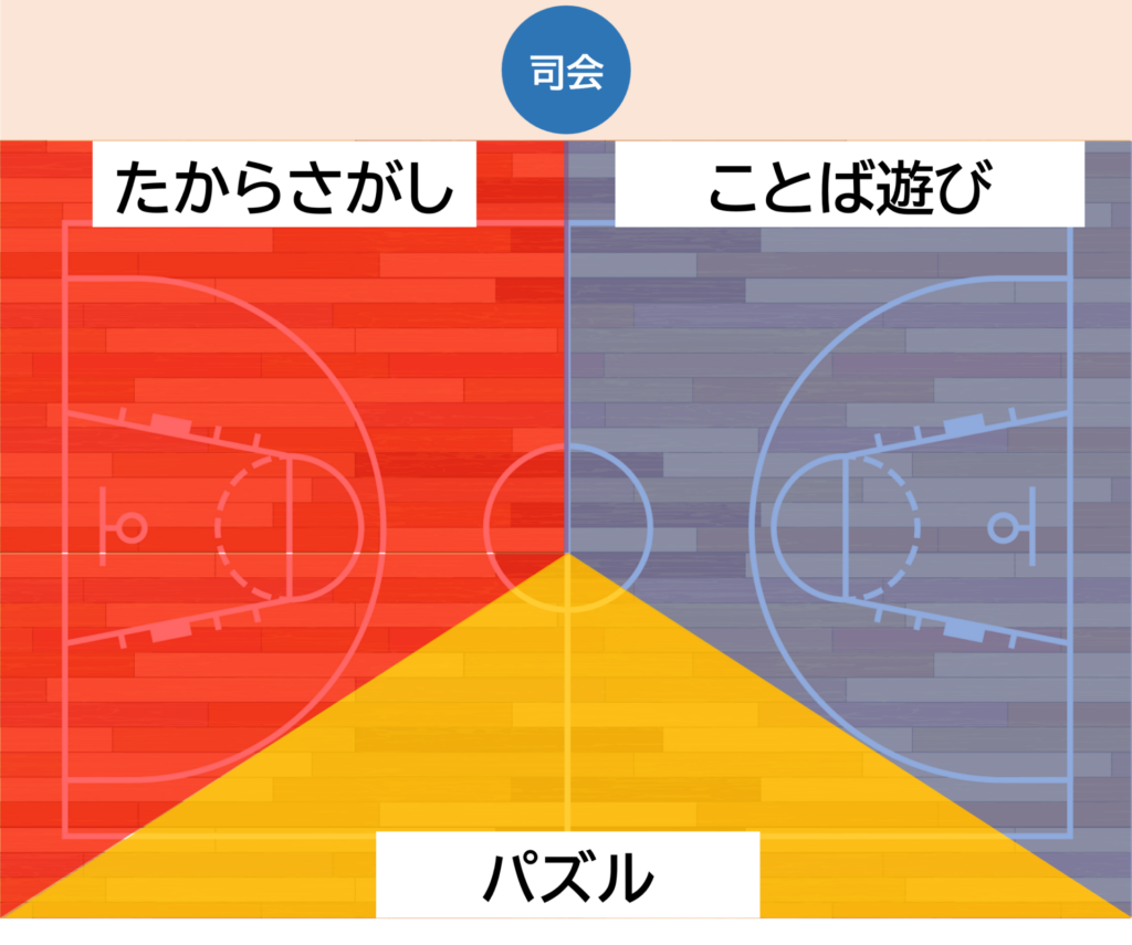 体育館の中を3エリアに分けて行う、チーム対抗の謎解きゲームです。