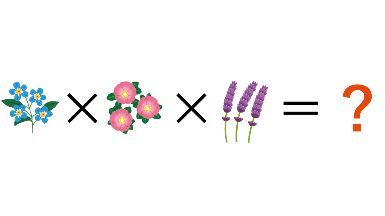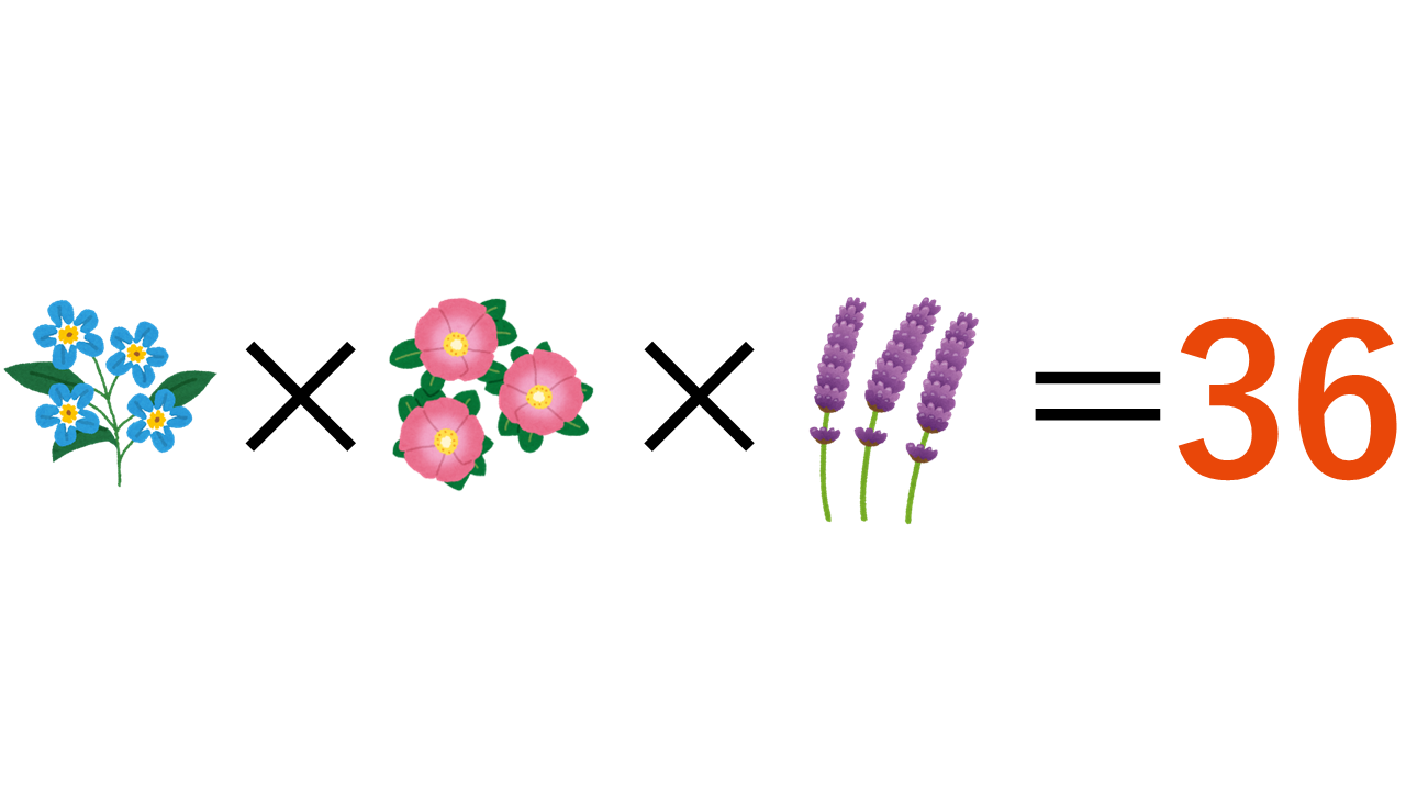 青い花が4、ピンクの花が3、紫の花が3で「4×3×3=36」です。