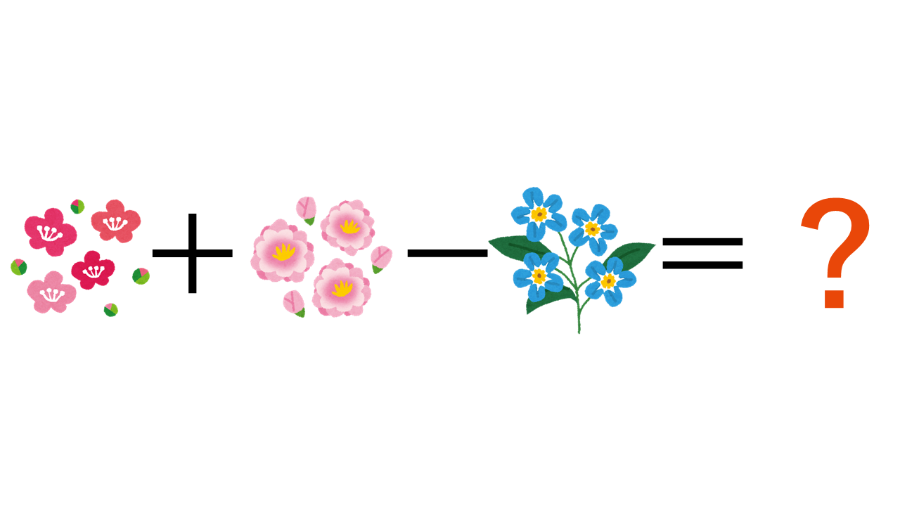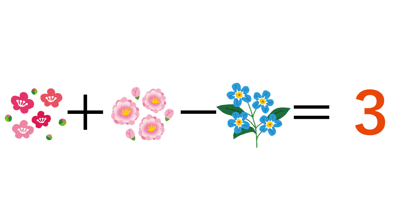 咲いているのは赤い花が4、ピンクの花が3、青の花が4で「4+3-4=3」です。