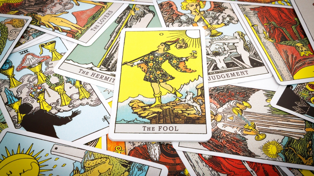 シメジは漢字で占地、アユは漢字で魚へんに占う(鮎)、3枚目は占いに用いるタロットカードです。