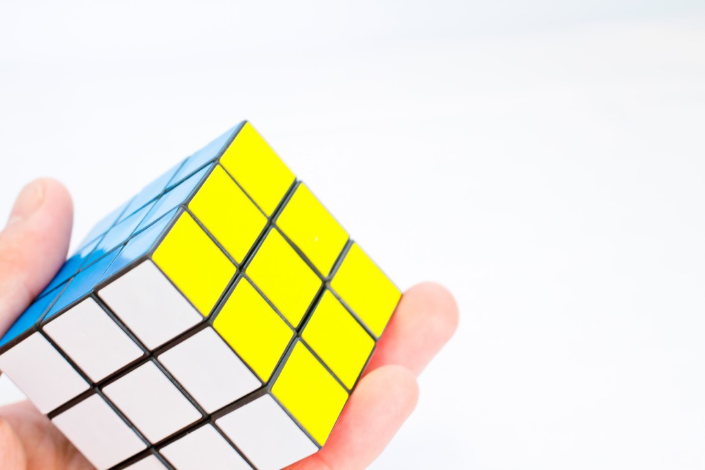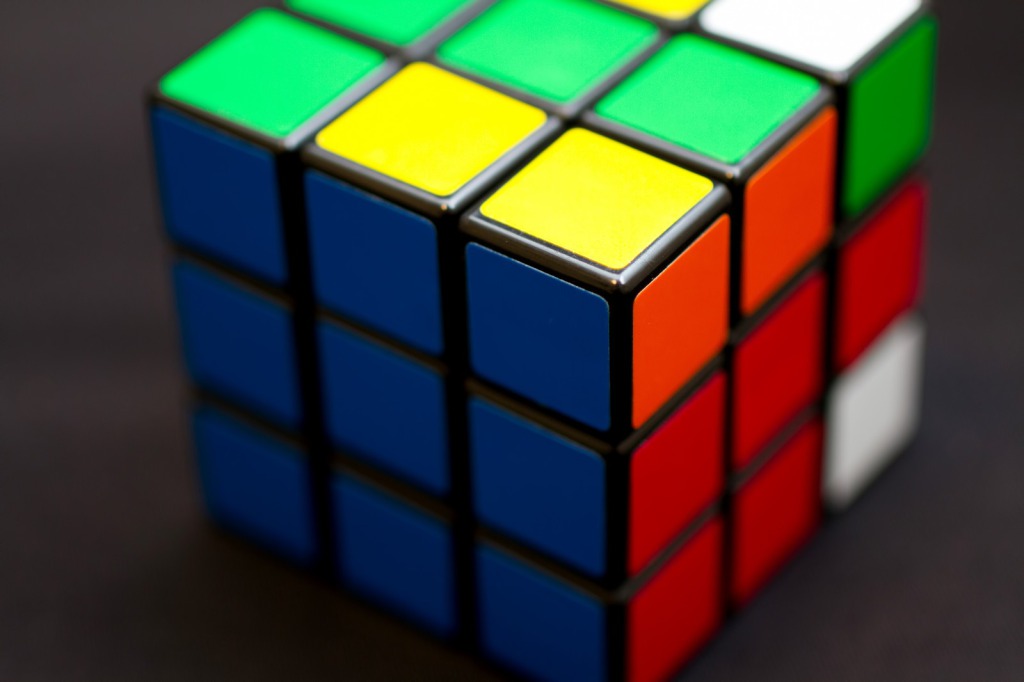 ルービックキューブの世界基準となっている6つの面に使われている色は、白、赤、青、黄、緑と何?