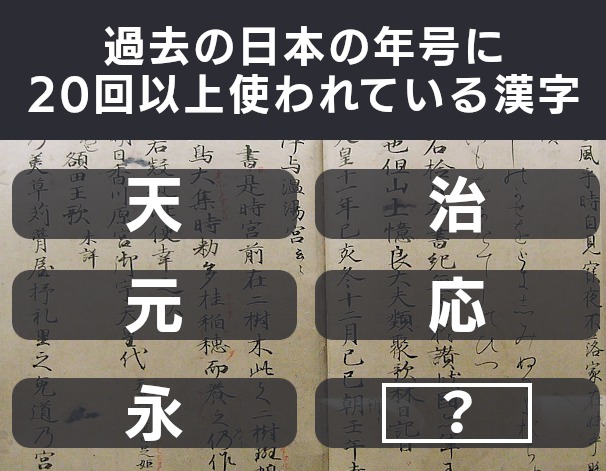 過去の日本の年号に20回以上使われている漢字は、天、治、元、応、永と何?