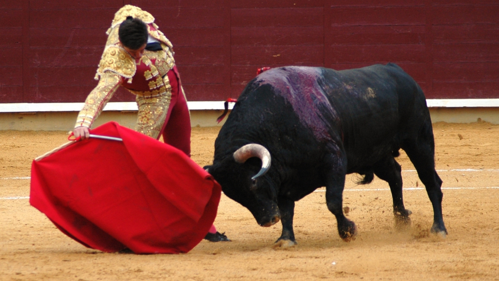 闘牛でマタドールが持つ赤いマントは「ムレータ」といいます。ウシは色を認識できないため赤に興奮するのではなく、ヒラヒラとした動きに興奮するといわれます。