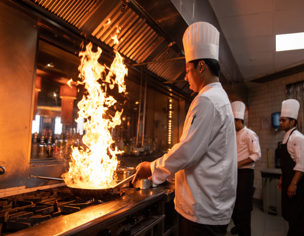 フランス料理で、フライパンにブランデーなどの酒をかけて