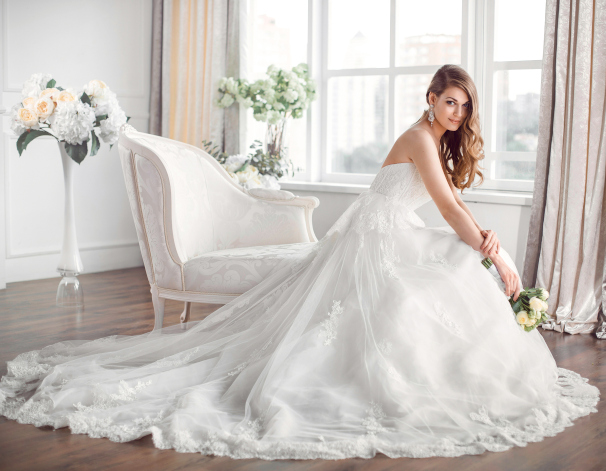 ウェディングドレスの床に引きずる裾の部分を何という?