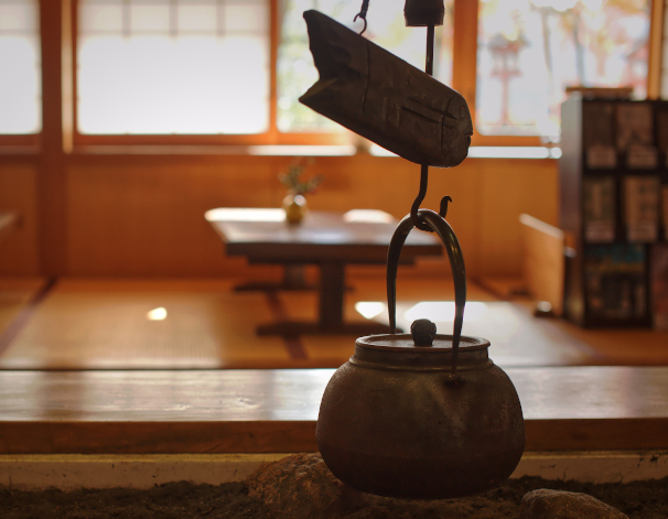 囲炉裏の上部にとりつけられた、やかんや鍋をひっかけるための鈎を何という?