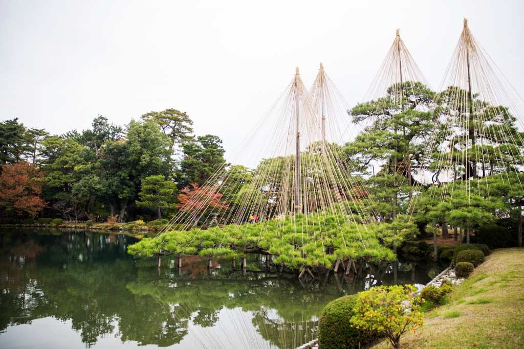 上は水戸市の偕楽園です。兼六園の木につけている柱のようなものは「雪つり」といい、冬に雪から木を守るための道具です。