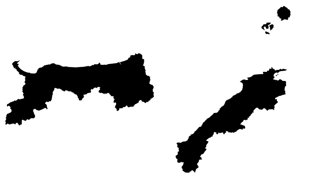 右は島根県です。鳥取県は左側ある弓ヶ浜半島が、イヌのシッポのようにみえるのが特徴です。