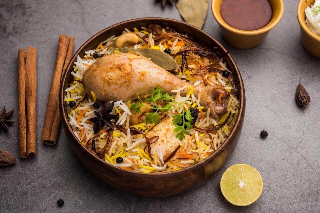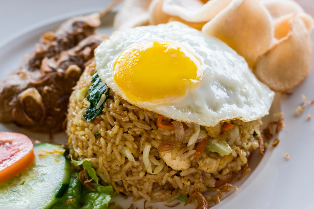 ナシゴレンは「ご飯を炒める」という意味のインドネシア料理で、よく目玉焼きがトッピングされます。上はインドのビリヤニです。