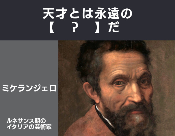 ミケランジェロは、絵画、彫刻、建築などあらゆる芸術で高く評価されていますが、天才であり続けるには常に修行を重ね、忍耐を続けなければならないという意味で語っています。