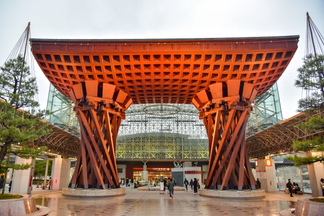 JR金沢駅の兼六園口にある、金沢の伝統芸能・能楽に使われるある楽器をイメージして作られた門は何?