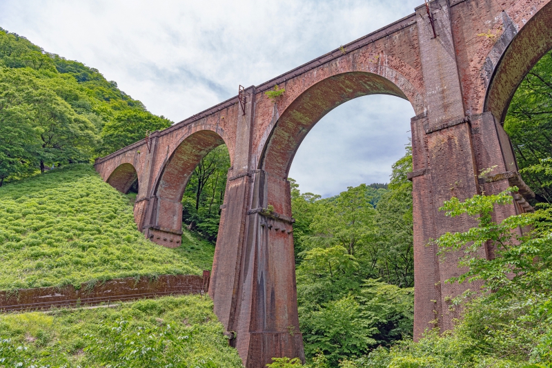廃線となった区間に残る通称「めがね橋」と呼ばれる鉄道橋がある峠はどこ?