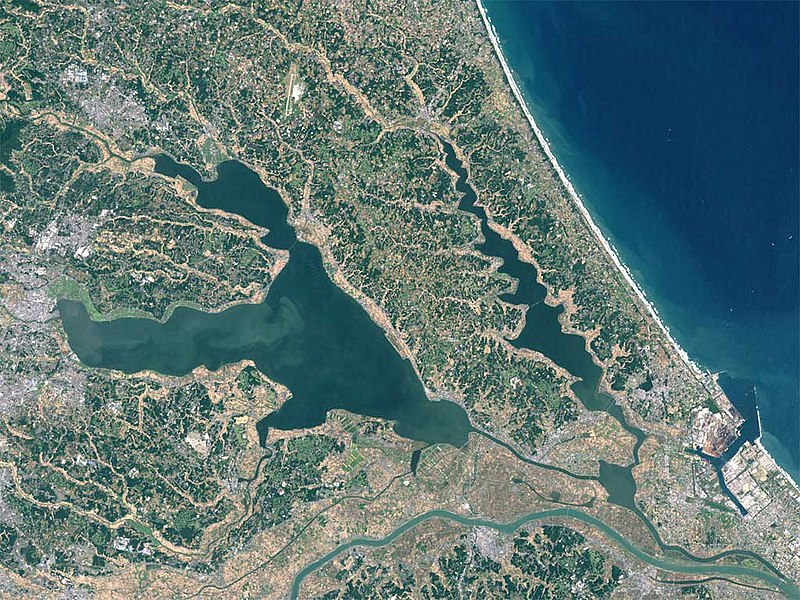当時リンドバーグは、水上飛行機に乗って太平洋横断飛行中でした。その途中にこの霞ヶ浦に飛行機で着水しました。(画像出典:https://ja.wikipedia.org/wiki/%E9%9C%9E%E3%83%B6%E6%B5%A6#/media/%E3%83%95%E3%82%A1%E3%82%A4%E3%83%AB:Kasumigaura_landsat.jpg)
