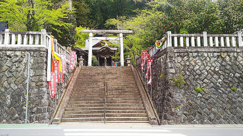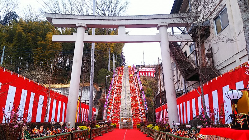 毎年3月のひな祭り前後に、多くの雛人形を石段一面に飾るイベントが開催されます。(画像出典:https://ja.wikipedia.org/wiki/%E5%8D%81%E4%BA%8C%E6%89%80%E7%A5%9E%E7%A4%BE_(%E5%A4%A7%E5%AD%90%E7%94%BA%E5%A4%A7%E5%AD%90))