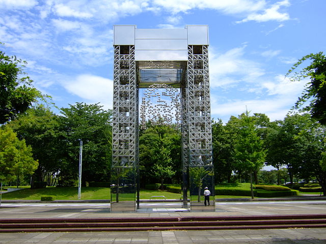 1985年につくば市で「つくば万博'85」が開催されました跡地に、この門が建てられました。見る方向によって、「エジソン」「アルキメデス」「ニュートン」「ガリレオ」の顔が見ることができます。(https://ja.wikipedia.org/wiki/%E5%BE%A1%E5%B9%B8%E3%81%8C%E4%B8%98#/media/%E3%83%95%E3%82%A1%E3%82%A4%E3%83%AB:%E7%A7%91%E5%AD%A6%E3%81%AE%E9%96%80.jpg)
