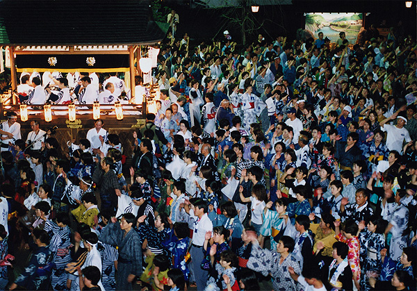 盆踊りの一種である郡上おどりは、7月中旬から9月上旬にかけて行われます。クライマックスは旧盆にあたる8月13~16日。この期間は徹夜で踊り続けます。(画像出典:https://upload.wikimedia.org/wikipedia/commons/7/71/Gujo_Odori.jpg)
