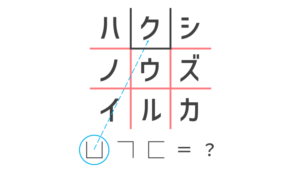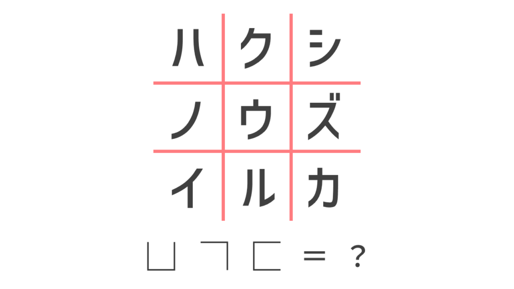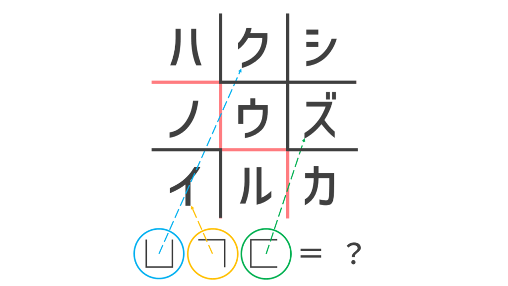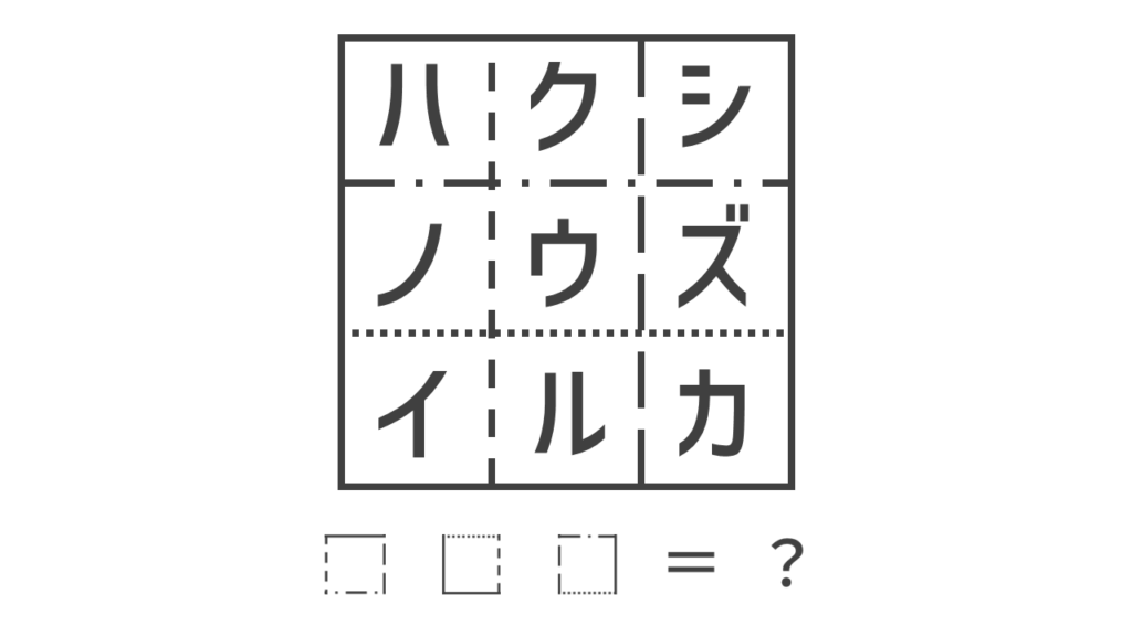 →この謎には「タテに3つ、ヨコに3つ」の文字があり、2本から4本の「線」でマスが仕切られているとわかります。