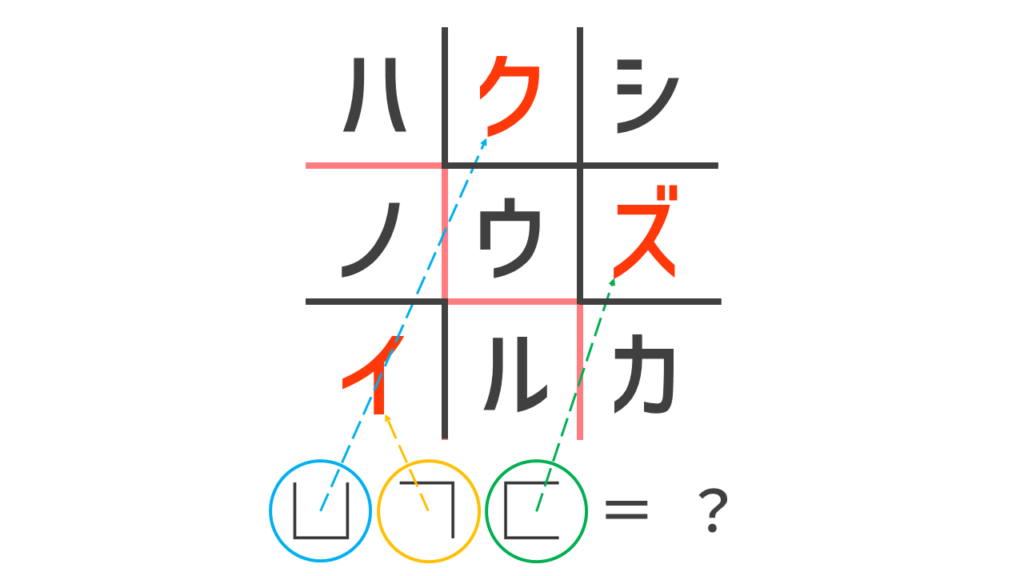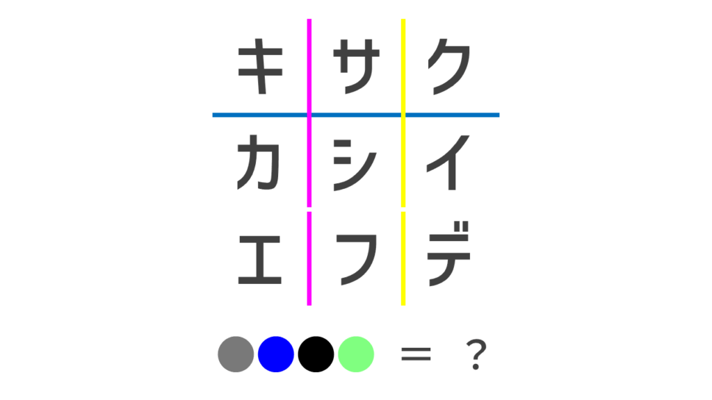 よって「中段中央→上段左→上段中央→中段右」の順番に読めばよいとわかるので、答えは「シキサイ(色彩)」となる。