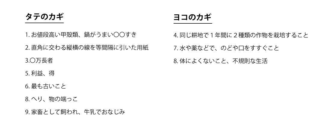 タテのカギ、ヨコのカギからマスに言葉を入れていきましょう。