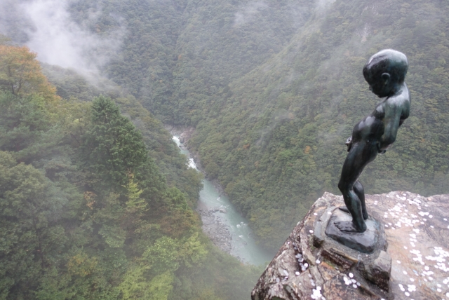 徳島県の祖谷渓には、断崖絶壁の上に立つ小便小僧がいる