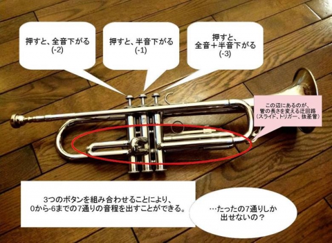 ピストンごとに「マイナス2」「マイナス1」「マイナス3」と音程の下がり幅が異なりますので、0からマイナス6までの7通りの音程を出すことが出来ます。