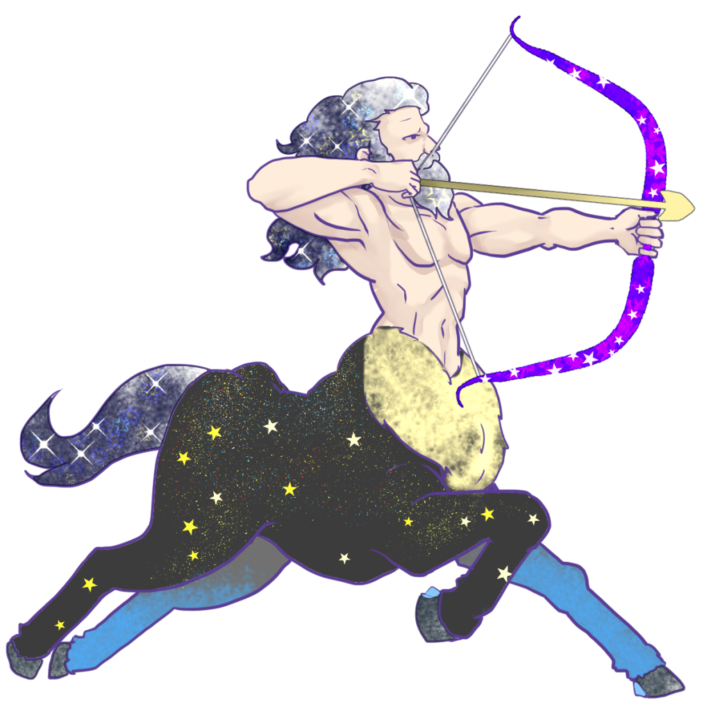 いて座は人の上半身と馬の下半身を持つケンタウロス“賢者ケイローン”の姿です。実は父クロノスが馬に化けて浮気をしたため半人半獣の姿で生まれてしまった神の子“見た目ケンタウロス”で大神ゼウスの異母兄弟です。太陽神アポロンと月と狩猟の女神アルテミス兄妹の教育を受け芸術、狩猟、医術、予言などの才能を開花させ賢者に成長し、ヘルクレスをはじめアスクレピオス(へび遣い座)、カストール(ふたご座)他、ギリシャ神話の多くの英雄たちを教育し世に送り出していました。また、ケンタウロス族からも賢く誠実な人柄で大変慕われていました。