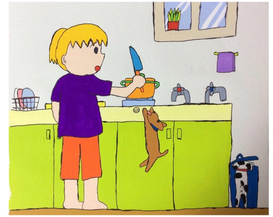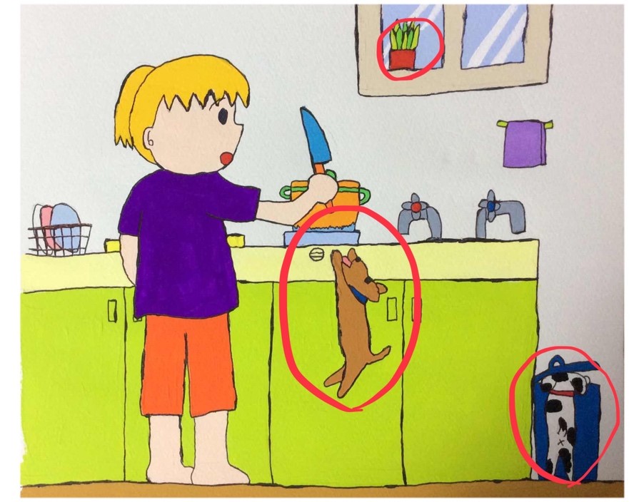 「ペットがキッチンで作業をしている飼い主の側で遊び、時にはゴミ箱を漁ったり激しく飛び跳ねたりしている」動画や写真も比較的よく見ますが、これはそれらの「キッチンで遊ぶ犬」の様々なケースをイメージした拙イラストです。この画面の中に、ヒヤリハット事例というべき要素はどれほどあるでしょうか?