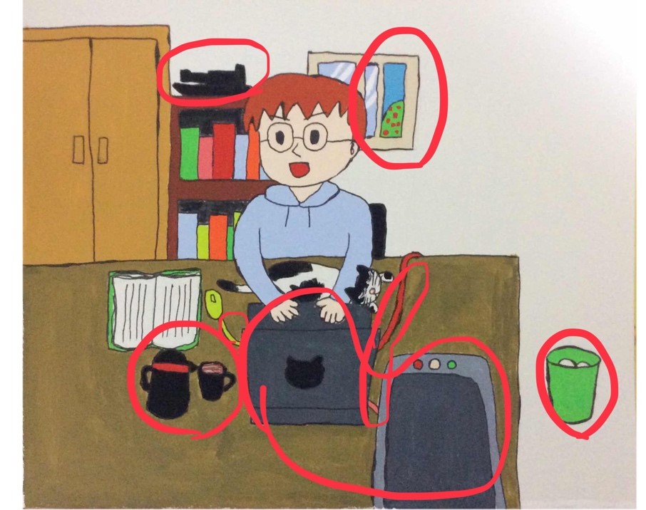 その他今回は「ヒヤリハット事例」のうちには入れませんでしたが、イラストではどうやら飼い主さんはデータを集めたりレポートや記事を書いたりしていて参考資料の本を開いているようですが、この本が万一図書館や他の個人などから借りたりしたものだったり、ご自分のものでも希少な古書だったりした場合には、ペットのいたずらによる汚損や損壊などの危険があるため、野放しのペットと同じ場所に放置しないようにしましょう。