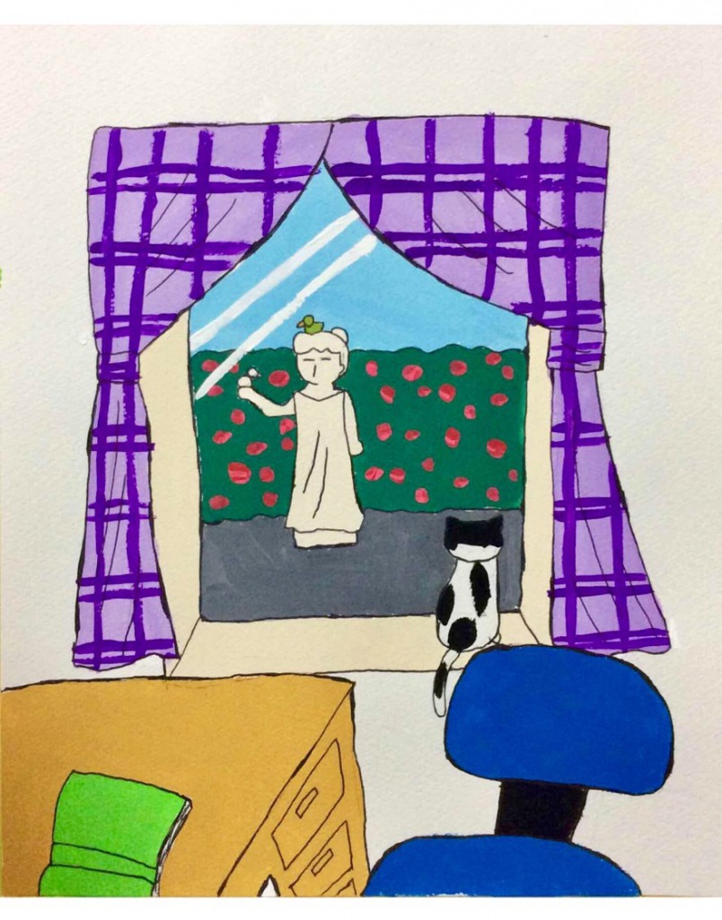 こちらの拙イラストは、そうした幾つかの「風景が主役のペットさん画像」を元にした架空のペット写真のイメージです。猫が出窓の枠に座り、外の風景を見ています。ちょっとしたバラ園を思わせる庭にはエクステリア用の古代風女神像が置かれ、女神像が手に乗せている小鳥像と頭に止まった本物の小鳥が偶然のほのかな面白さを醸し出しています。また、部屋の中の机には読みかけと思われる本が伏せてあり、猫の飼い主さん本人の姿は見えないものの存在感が伝わってきます。